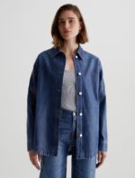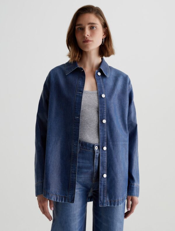 Glazed denim makes the Kea Jacket a statement piece. Part shirt, part jacket—it’s an easy, oversized shirt jacket in our Liquid Lyocell Denim. The soft cotton blend is washed to a faded blue shade and glossed with a clear coating for a shiny water-repellent finish.